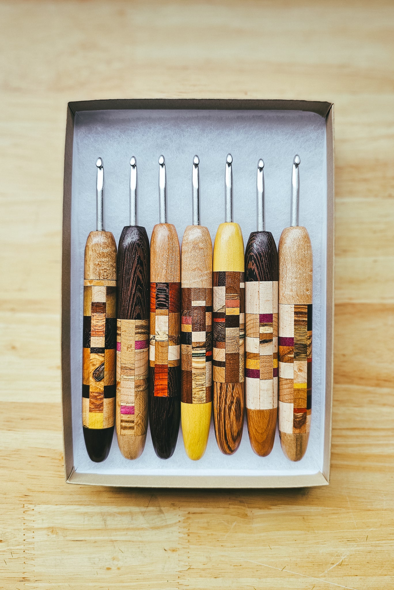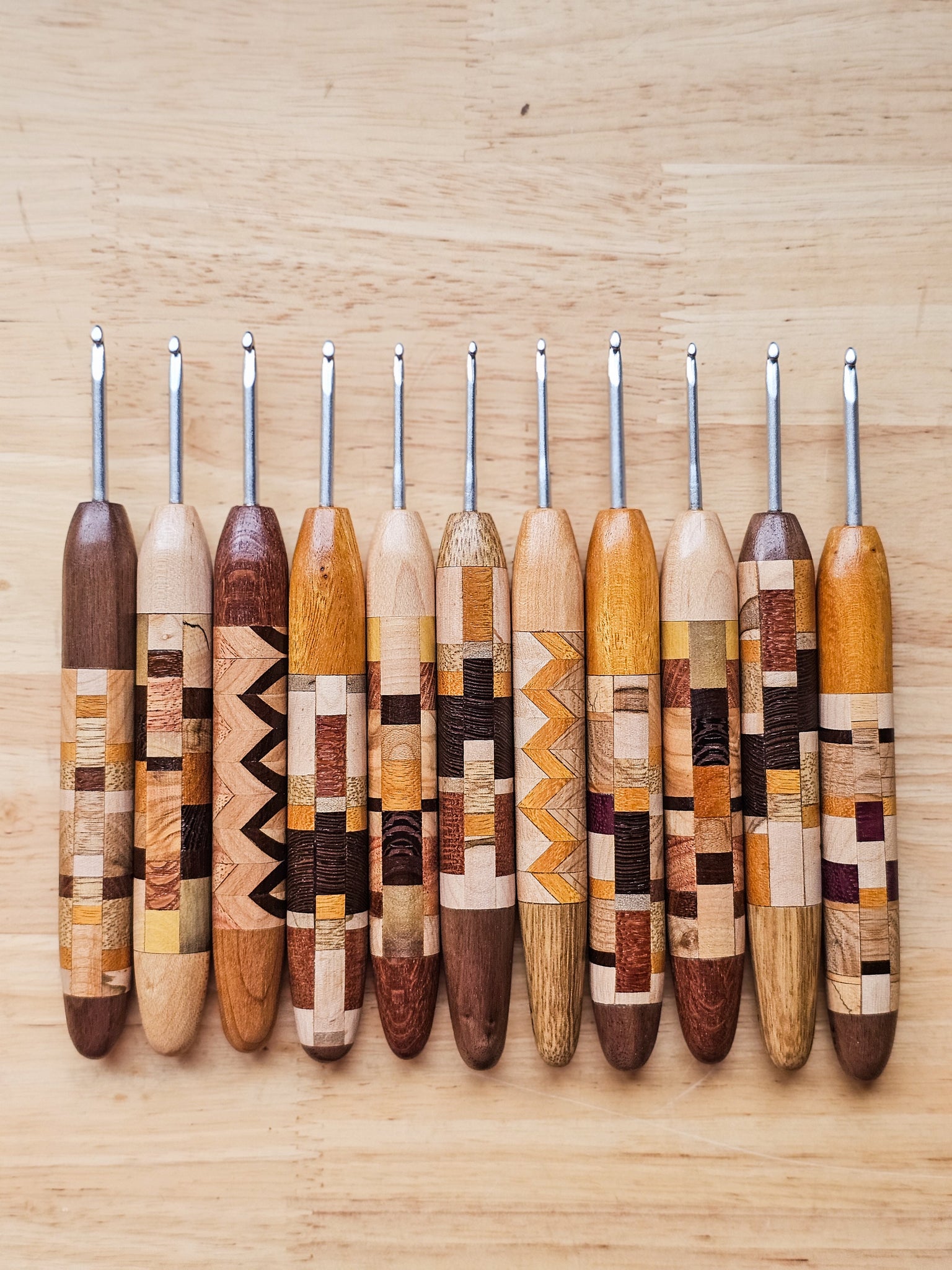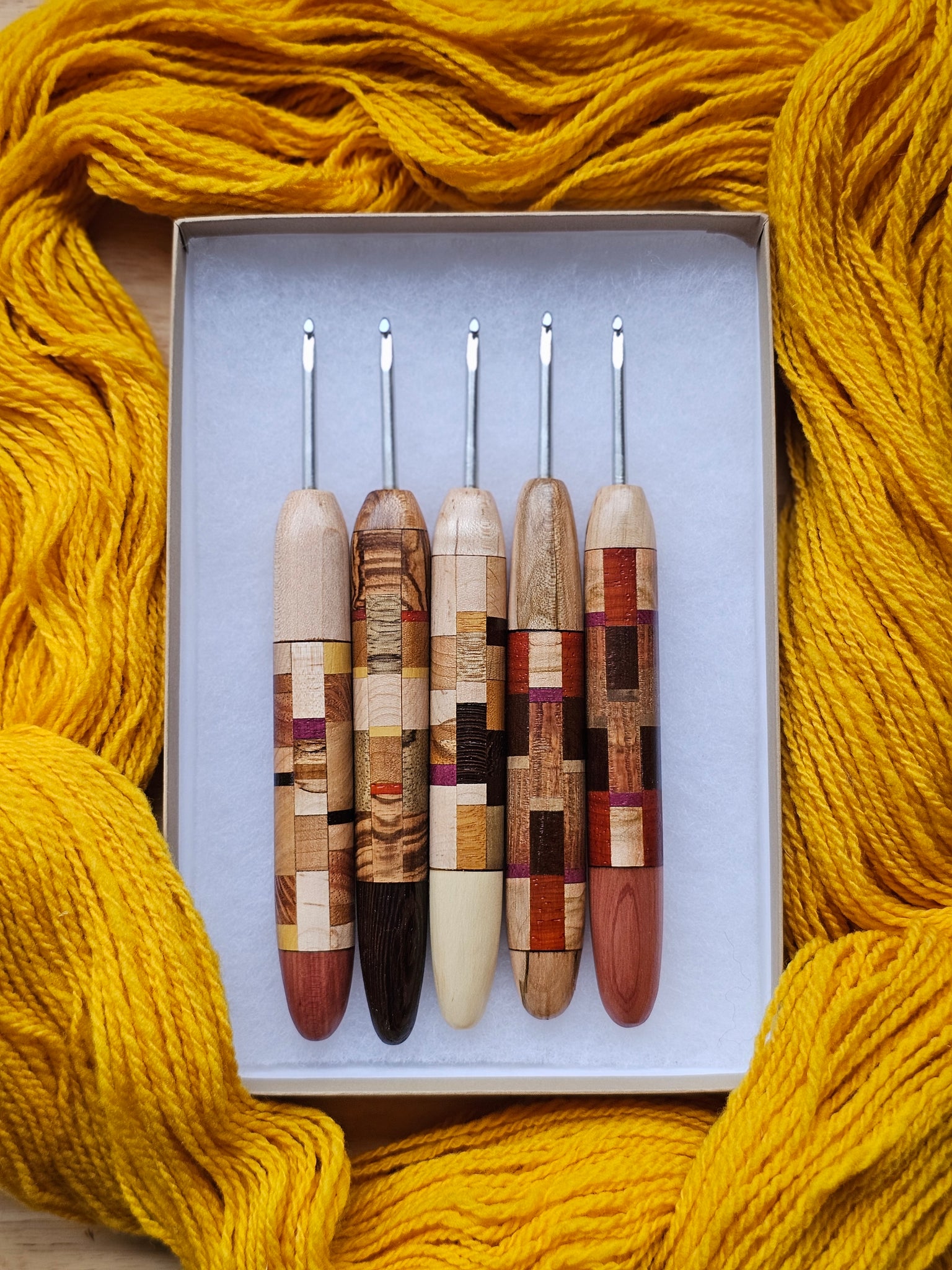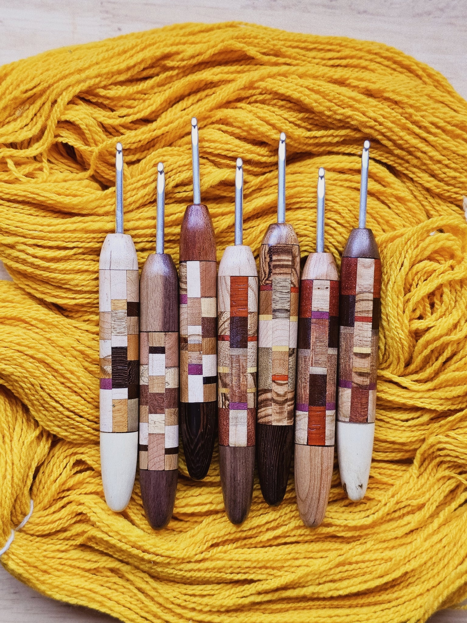 Each hook is sanded to yarn-worthy smoothness, and treated with a polyurethane wood sealant