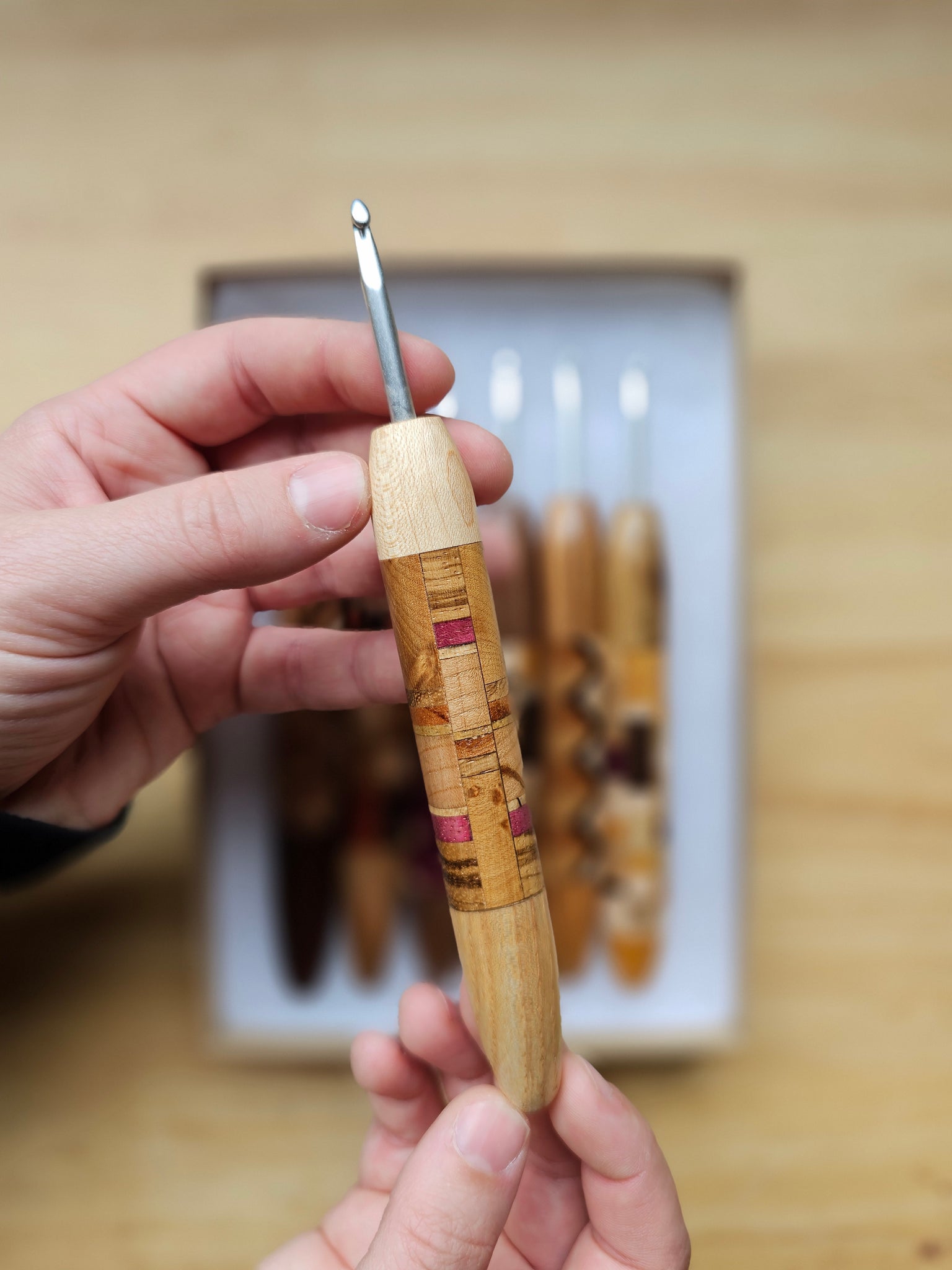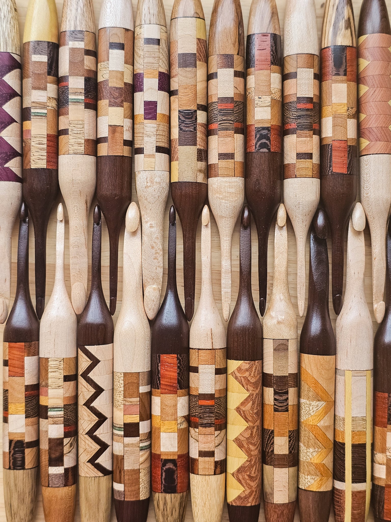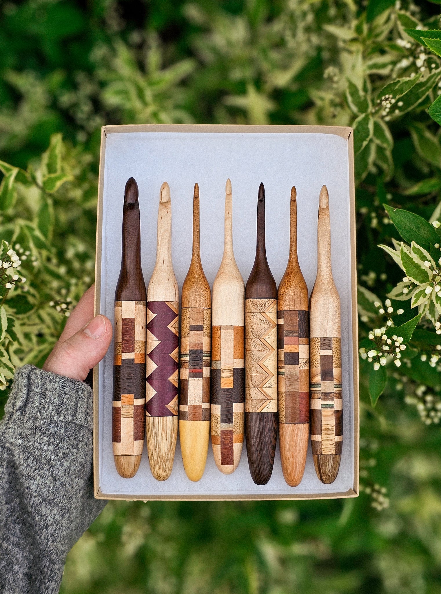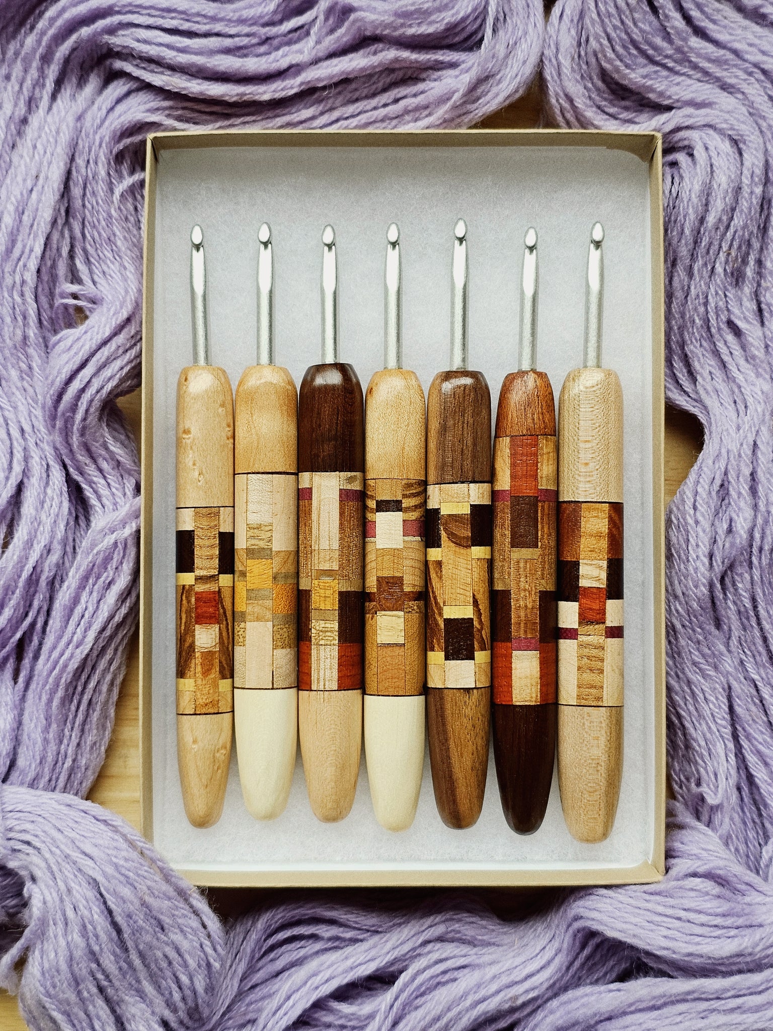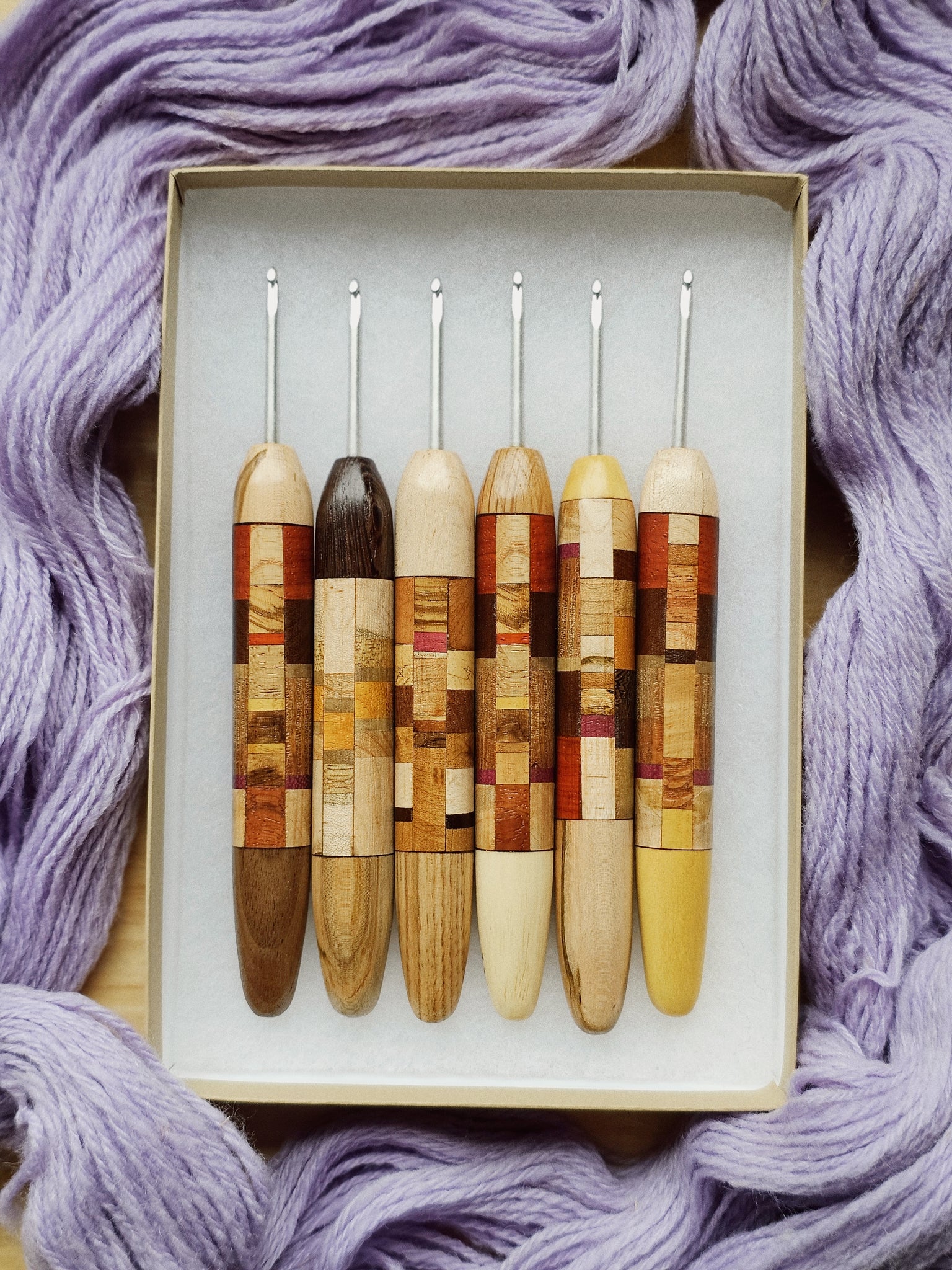 Each hook is sanded to yarn-worthy smoothness, and treated with a polyurethane wood sealant
