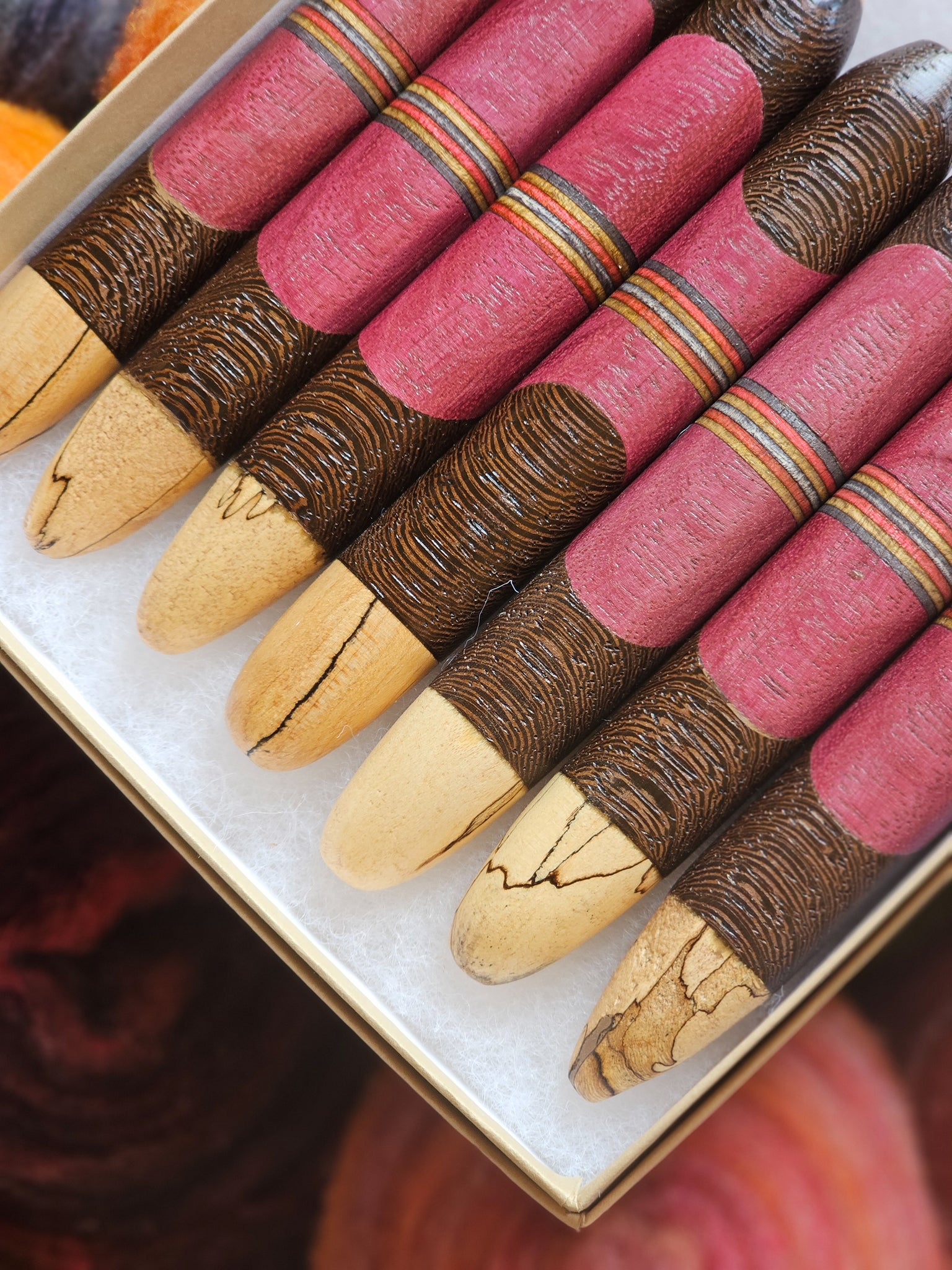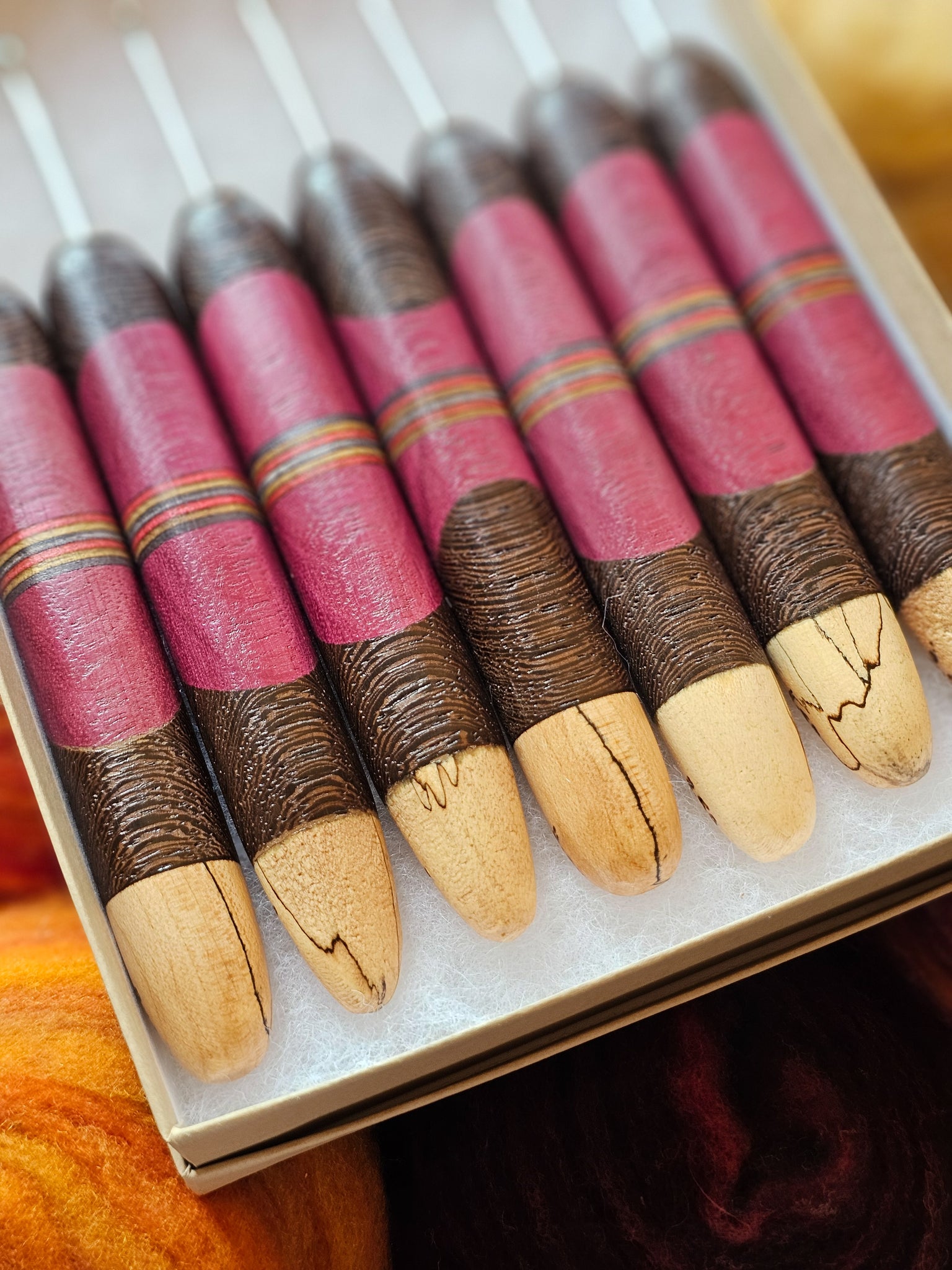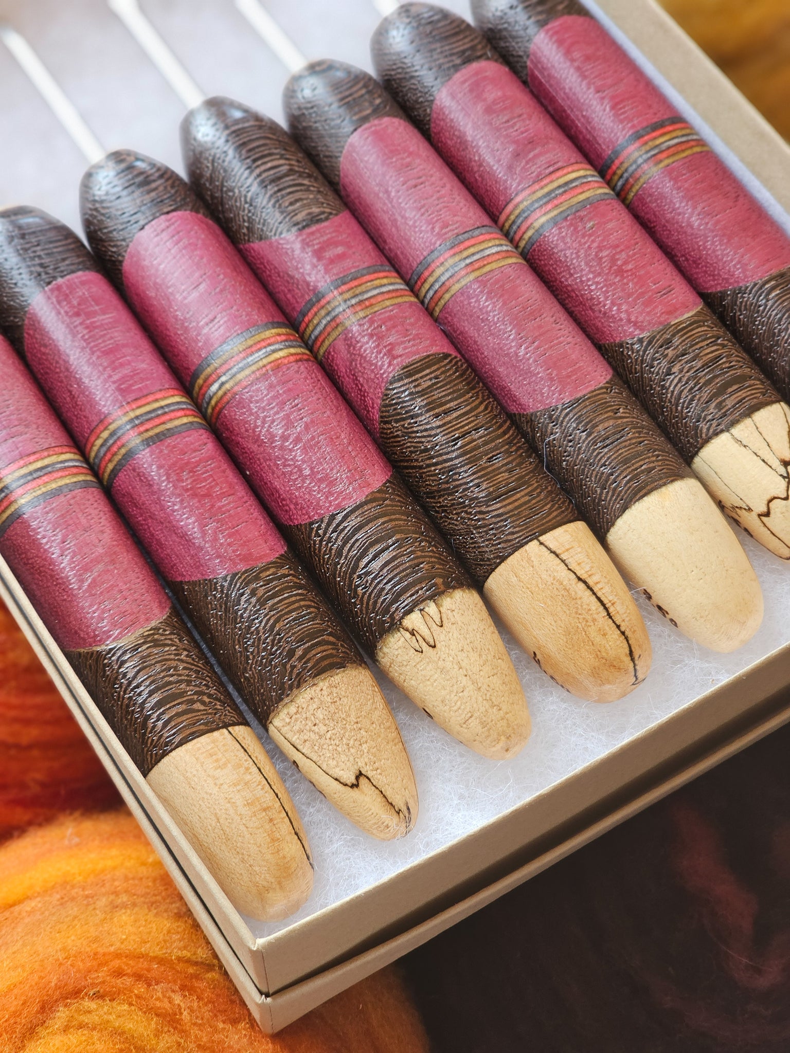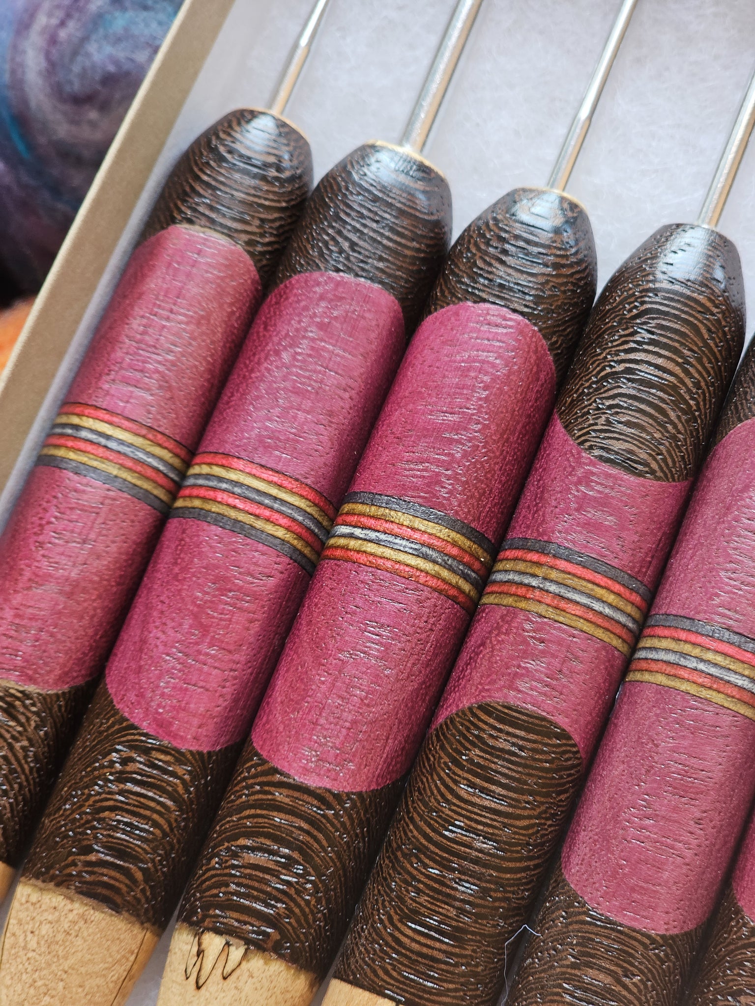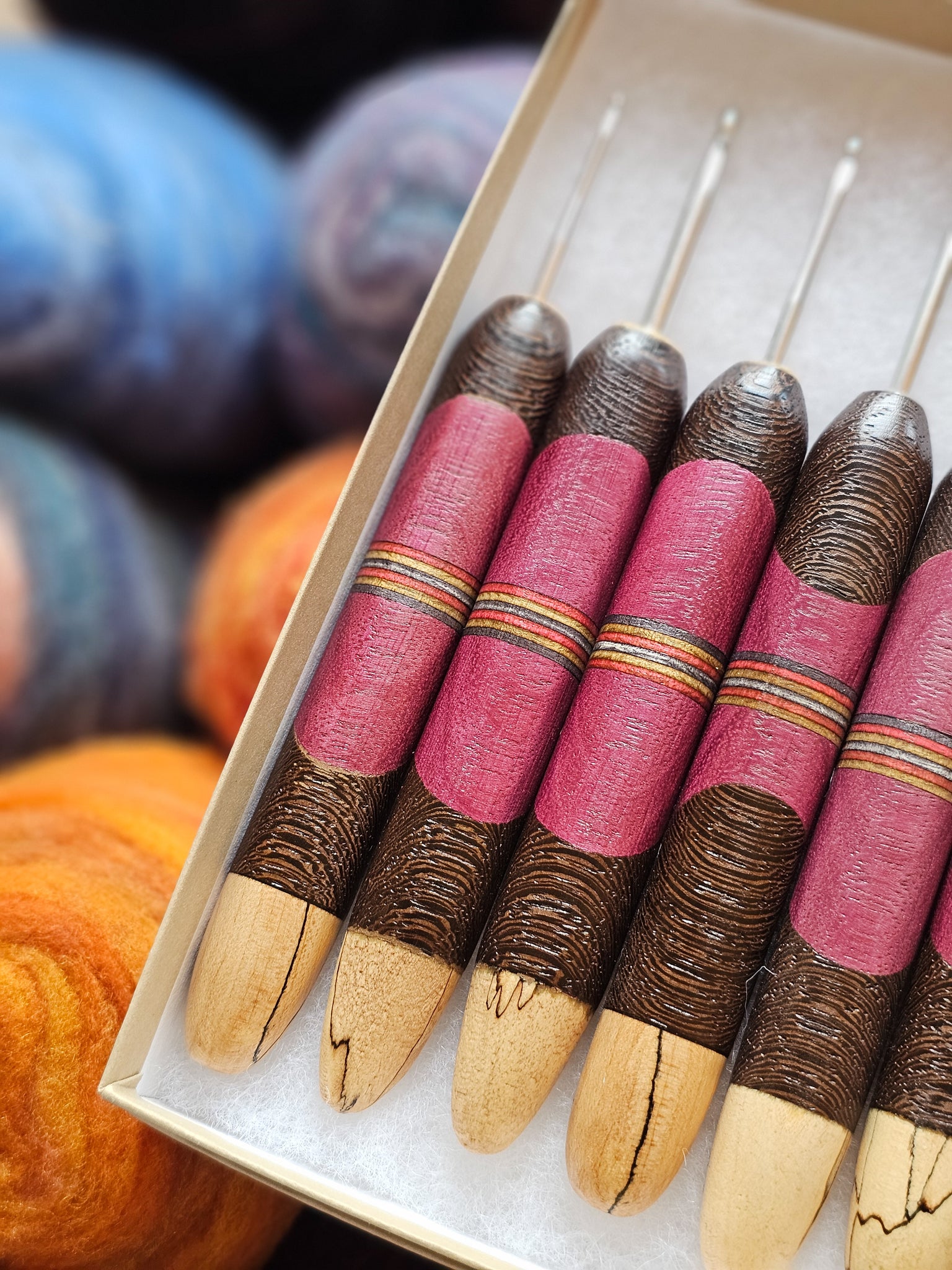 Meet our special PHILE Collection crochet hooks inspired by Astrophile (lover of stars)! These hooks feature wenge + purpleheart + spectraply + spalted maple in the design. Just select the size you want, and we'll send you one! Please note, the hooks in the photos are just samples of what the design looks like, you may not receive one of those exact hooks as this is a mystery option.